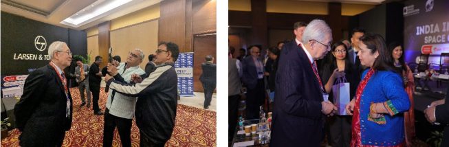 (左)常田氏と、有人宇宙飛行「ガガンヤーン」の宇宙飛行士候補。宇宙飛行士は若年層の憧れの的となっています。(右)産学官のトップが一堂に会し、宇宙開発の今後について活発に議論しました。